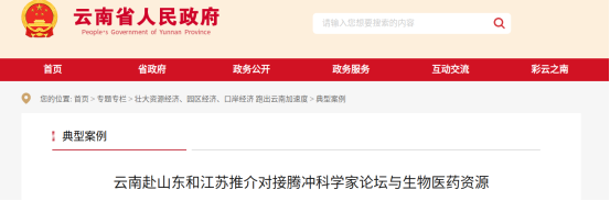 近日,云南省人民政府网站发布了“壮大资源经济、园区经济、口岸经济 跑出云南加速度”典型案例,“云南赴山东和江苏推介对接腾冲科学家论坛与生物医药资源”入选典型案例。