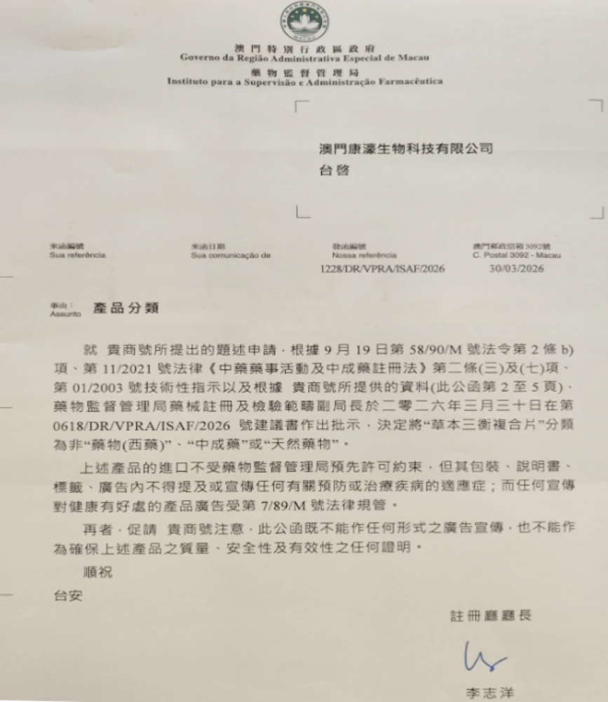 云南滇合康生物科技有限公司是云南省大健康产业重点培育企业,依托云南特色草本、灵芝、药食同源原料产区优势,搭建从原料、研发、生产、包装到销售的全链路本土化体系。为更好承接草本三恒复合片在澳门获批注册及后续市场拓展,2026年2月,云南滇合康生物科技有限公司在澳门成立澳门康濠生物科技有限公司,立足澳门区位优势,深耕草本康养研发、跨境产业协同、名优滋补品运营、滇澳康养项目联动四大核心板块,深度链接两地政策红利与产业资源,将助力滇澳两地大健康产业高质量协同发展。