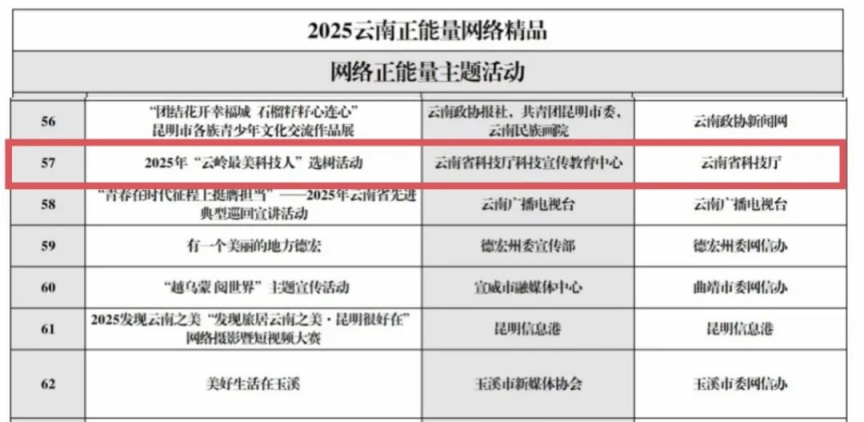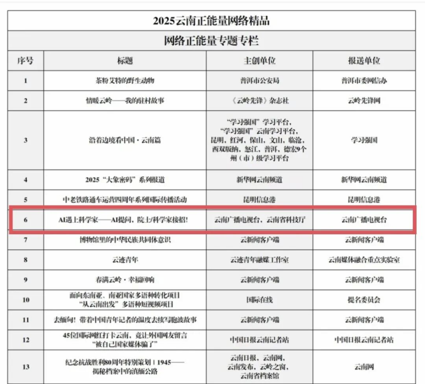 近日,2025云南正能量网络精品征集展播活动评选结果揭晓,共发掘和推出515件有温度、有力量、有影响力的云南网络正能量精品。其中,云南省科技厅推荐报送的《2025年“云岭最美科技人”选树活动》被评选为“网络正能量主题活动”精品,云南广播电视台、云南省科技厅共同制作的《AI遇上科学家——AI提问,院士/科学家接招!》被评选为“网络正能量专题专栏”精品,向社会推荐展播。